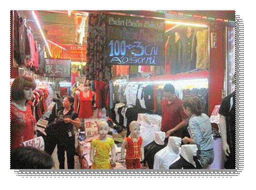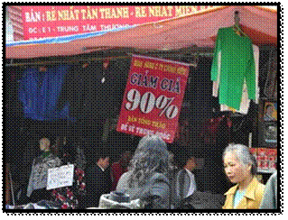 我来时,虽然游客还是络绎不绝,但看的多,买的少。945个摊位中的471个已因生意淡薄而倒闭,剩下的大都奄奄一息。价格一落千丈:三件衬衣只卖10万元,甚至有些摊位挂牌减价90%(左图)!真是夜市萧条。游客云集,竞相购买从一针一线,到时装、家电、电子器材的黄金时代已一去不复返。