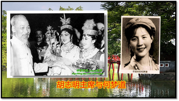 经过多少年后我才知道,十一岁就加入中国人民解放军的何梦道,是《八千湘女上天山》的其中一人。可是,在新疆歌舞团出访越南前,何梦道因当年所谓“家庭出身”问题一度不准出国。出国任务下达后,新疆歌舞团急急忙忙命令何梦道在短期间内培训出一位替身舞蹈演员,取代何梦道自己。可是替身舞蹈演员无论如何努力培训,也无法演绎《葡萄架下》舞蹈的精髓。当年,《葡萄架下》领舞演员天已注定就是她-何梦道,无人可替代。最后,在中国对外文委领导的首肯下,何梦道才能如愿访越,成为越南的“中华人民共和国西域沙漠发现的一颗明珠”,才有后来胡志明主席赞赏何梦道艺高色绝的美好回忆。