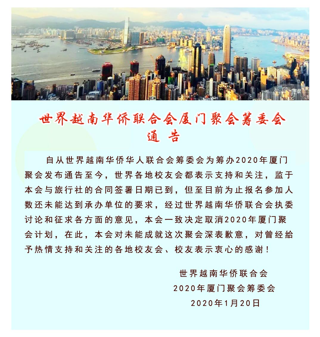 世界越南華僑聯合會“2020年夏門聚會”的官方通告