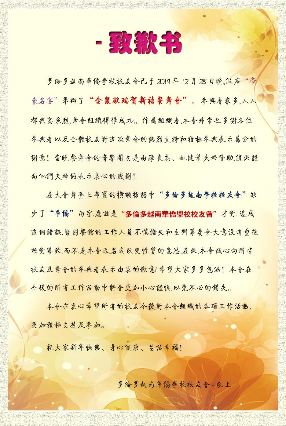 多伦多越南华侨学校校友会贺年信