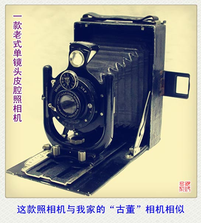 我家还有一台老式单镜头皮腔照相机,什么牌子,我记不起来了。那台照相机的机身是一个木盒子,镜头与机身之间由皮腔连接。打开金属盖板,就看到镜头蜷缩在盒子里面。捏紧镜头底座前面有弹簧装置的两个小立柱,将镜头套进面板内侧的金属导轨板,镜头就可以前后滑动进行粗略调焦了,通过相机背后的毛玻璃来取景。导轨板下方有金属小滚轮,旋转它可以带动导轨板前后移动,起精细调焦的作用。那台照相机最特殊的地方是机身与胶卷暗盒“各自为政”。胶卷暗盒背后有圆形小红窗,用于观察胶卷保护纸上的符号和数字。要拍照时,才把暗盒插进相机的暗盒槽,抽出暗盒盖板就可以拍照了。由于年久疏于保养,机身外面的黑色蒙皮多处脱胶,有的地方像松树皮那样翘起来;黑色皮腔的拐角折叠处也严重磨损,多处漏光,真有历尽沧桑的悲凉感觉。我在闲暇的时候,曾多次把那台“古董相机”拿来摆弄。我反复调整光圈的连杆,好奇地看着由好几片黑色钢片构成的光圈忽大忽小,觉得很有意思;或者听快门释放时发出细微的“嗞嗞”声,那声音的长短(曝光延时)是可以调整的,有时短到我都来不及反应,紧接着就听到那清脆悦耳的“咔嚓”一响,好象是我完成了一次“拍摄”实践似的,一丝喜悦的心情油然而生……