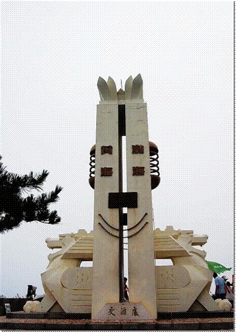 在丹崖山以西,隔着一个小海湾,有一块突入海中岬角称为蓬莱岬。这才是“最北端”的最北端,在这里画一条直线和旅顺老铁山灯塔相连,就成了渤、黄二海的分界线。西边是清澈的渤海,属中国内海;东边是浑浊的黄海,是国际海,泾渭分明。就在两海交汇处,有一座神龙分海──黄渤海分界坐标:设计者独具匠心,两条盘曲而上的巨龙,象征黄渤二海,二龙共衔一珠,象征蓬莱,同时也是黄渤海的准确分界点(下图)。