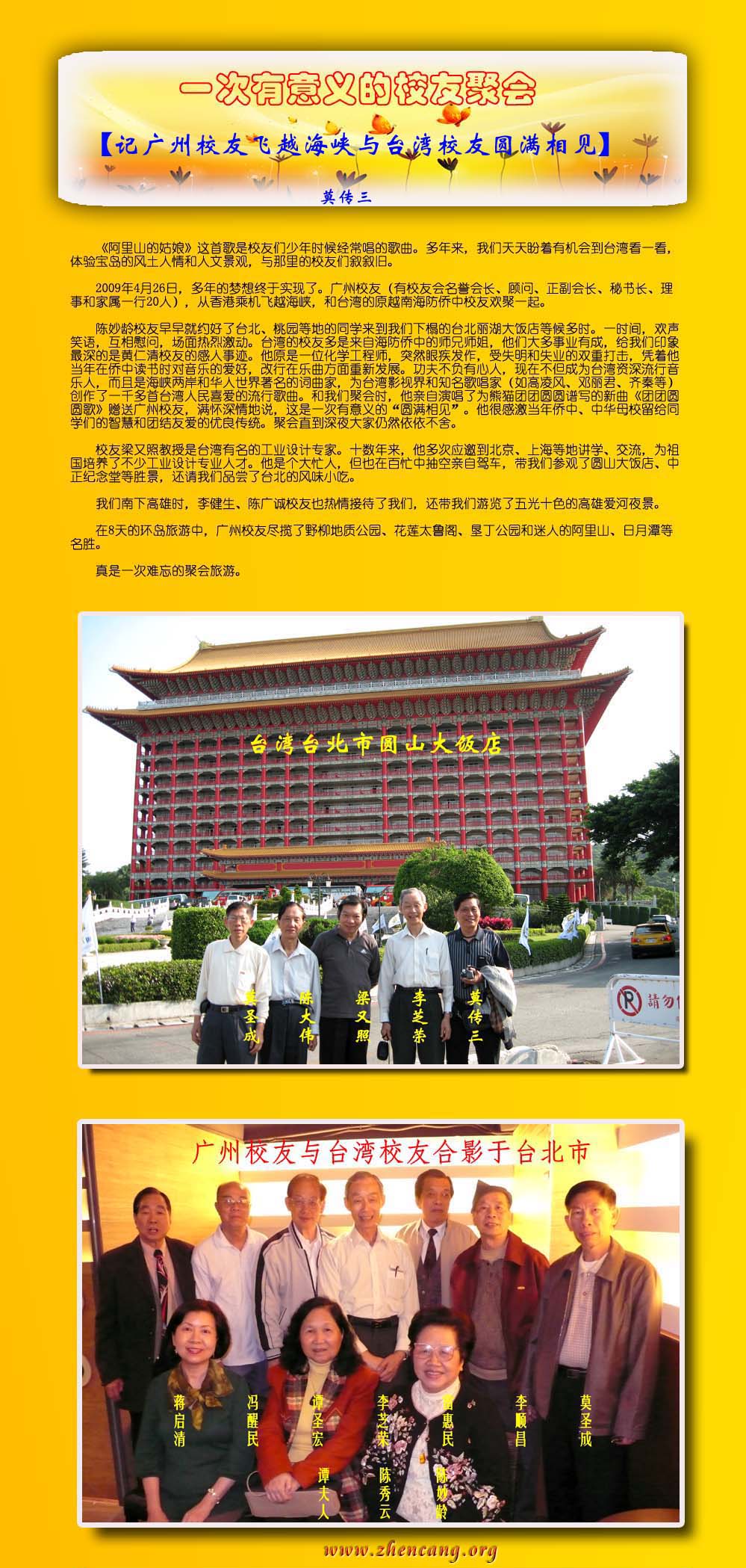 注:本曲作者海防侨中校友黄仁清是誉满全台湾的资深音乐人。他创作的各类词曲上千首之多,曾为台湾70多部电影、电视谱写主题曲,如林青霞主演的《燃烧吧火鸟》等。著名歌星高凌风、蔡幸娟、邓丽君等演唱的歌曲许多也出自他的手,他虽然双目失明,但得知校友广州聚会,特地谱写此曲献给大会,届时亲临与校友们同台演唱。
